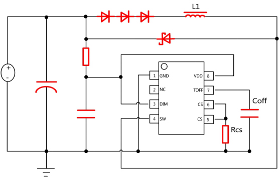 LED輸出電流由電流采樣RCS以及TOFF等參數(shù)設定: